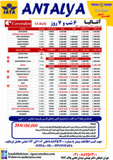 تورآنتالیا26شهریور CORENDONairline 6شب و7روز بیمه مسافرتی،ترانسفرفرودگاهی،راهنمای فارسی زبان جهت کسب اطلاعات بیشترباشماره تلفن88751300داخلی های 106الی113تماس حاصل فرمایید...